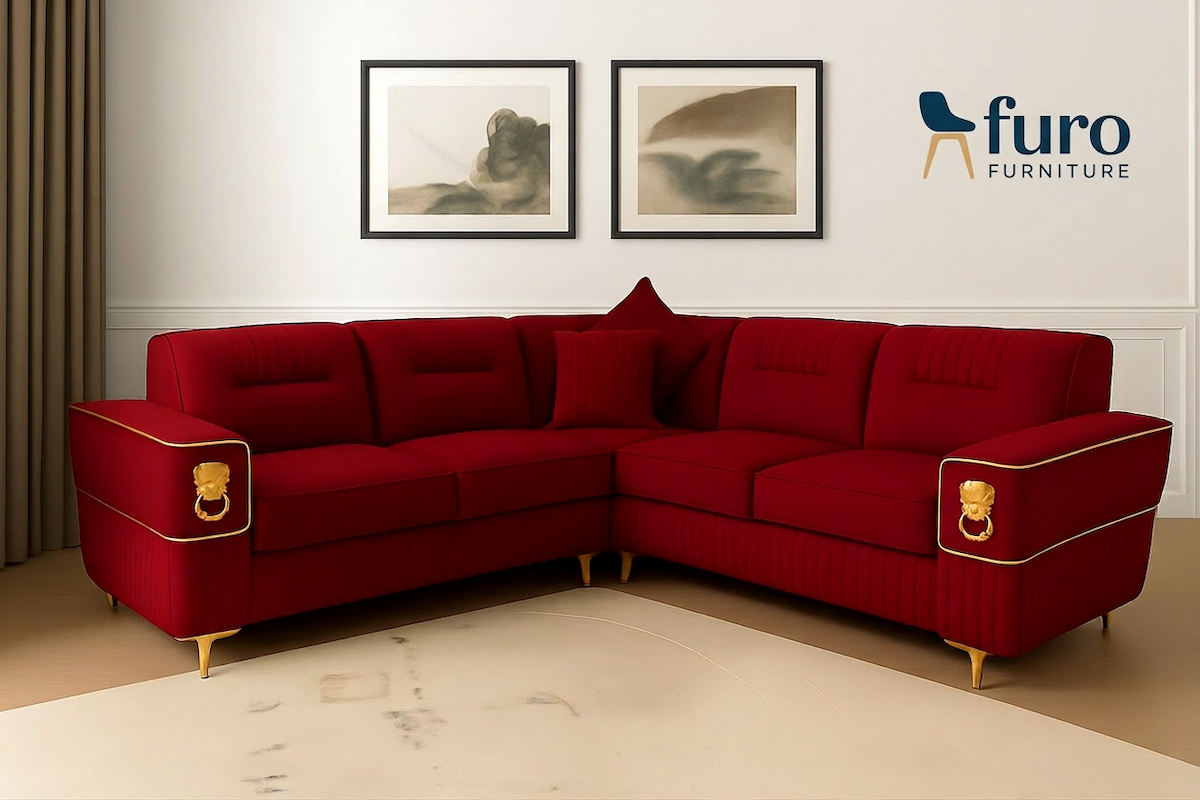 Introducing the Luxury L-Shape Designer Sofa from Furo Furniture — the perfect blend of style, comfort, and sophistication. Designed for modern living rooms, this sectional sofa showcases a striking maroon fabric upholstery paired with gold accent details that enhance its luxurious appeal.